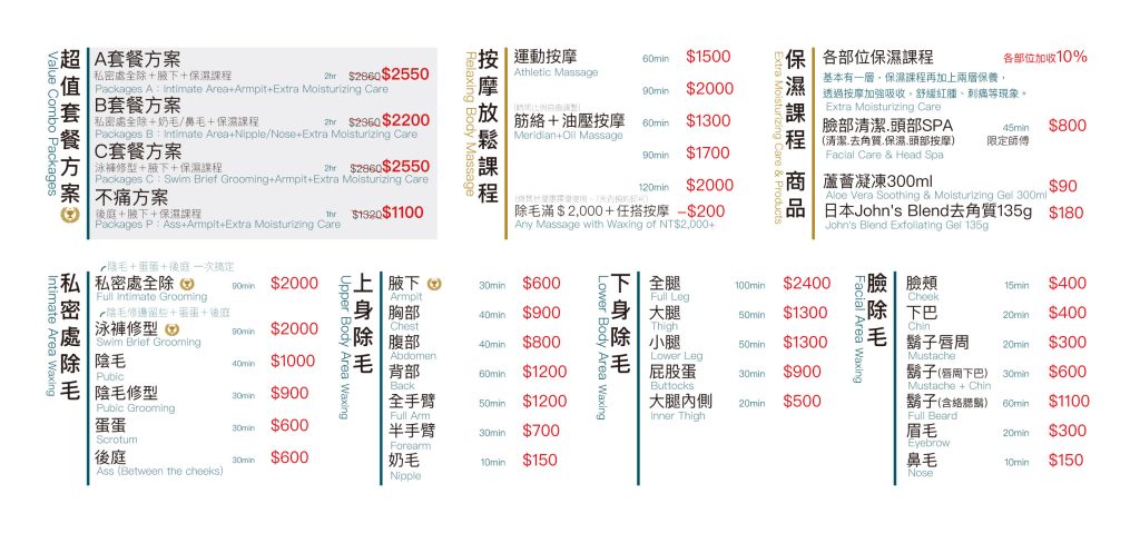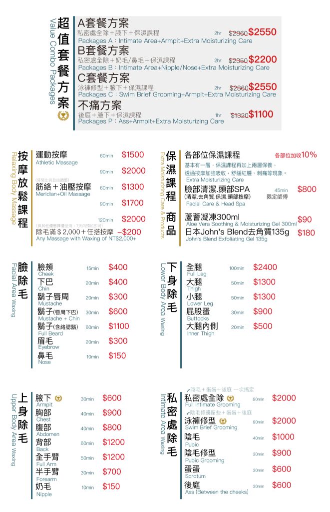 台北店 高雄店 創造除毛 - 台北店 細心・貼心・專業・採取一人一間預約制・低消 500元 設備 淋浴間・沐浴乳・拖鞋・毛巾・浴袍・冷暖器・洗髮乳(PM6:00後提供) 地點 台北市萬華區柳州街81號 提醒 本工作室追求高品質的服務時間可能相較長一點希望讓客人創造更乾淨的自己 *以上時間(包含沖澡及除毛後保養)僅供參考,會依照每位客人接受程度、狀況視情況減少 創造除毛 - 高雄店 細心・貼心・專業・採取一人一間預約制・低消 500元 設備 淋浴間・沐浴乳・拖鞋・毛巾・浴袍・冷暖器・洗髮乳(PM6:00後提供) 地點 高雄市新興區中山一路14-6號 提醒 本工作室追求高品質的服務時間可能相較長一點希望讓客人創造更乾淨的自己 *以上時間(包含沖澡及除毛後保養)僅供參考,會依照每位客人接受程度、狀況視情況減少